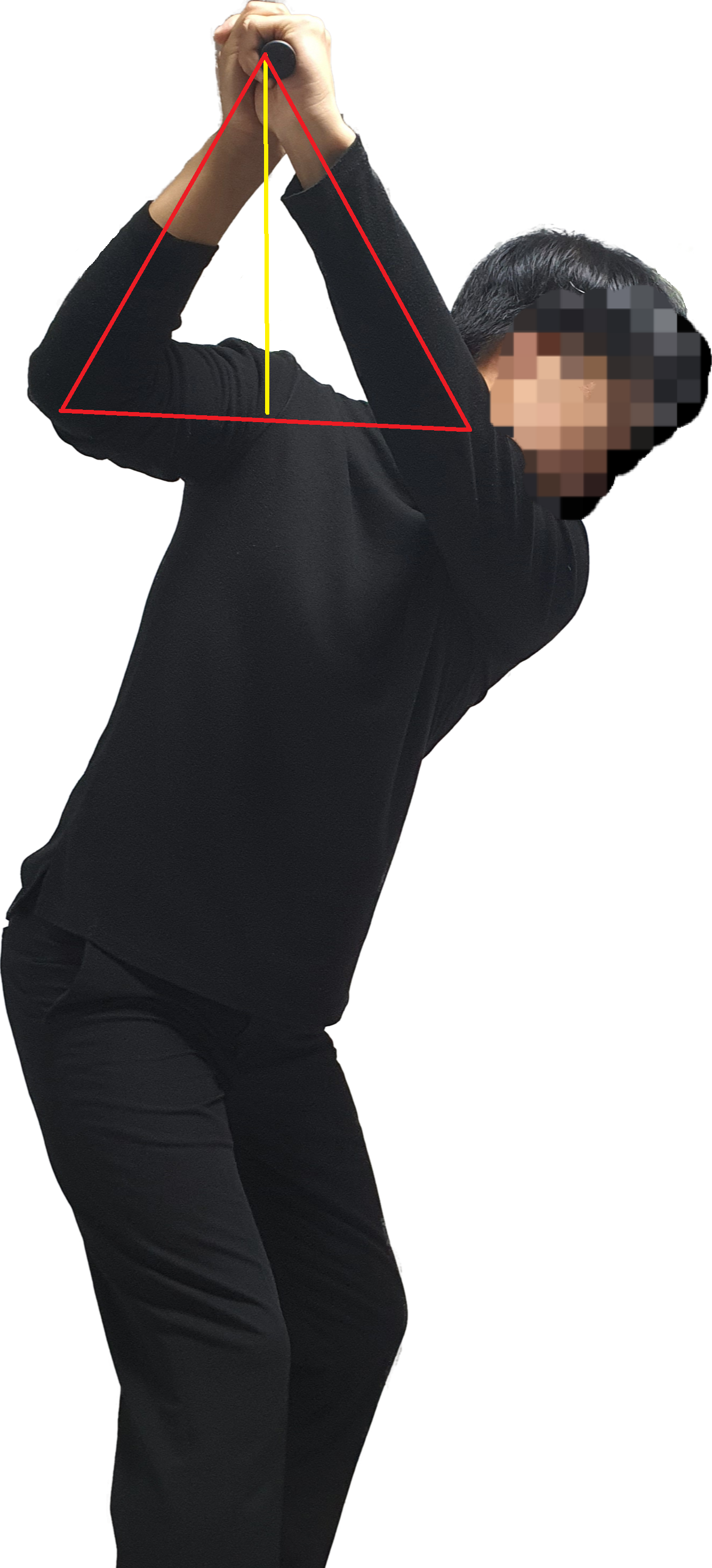 어드레스부터 강조한 삼각형은 백스윙의 탑까지 그대로 유지가 됩니다.